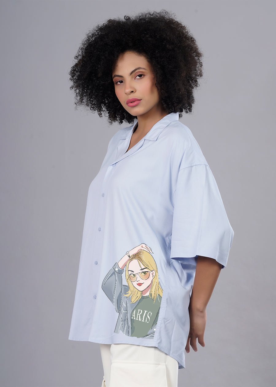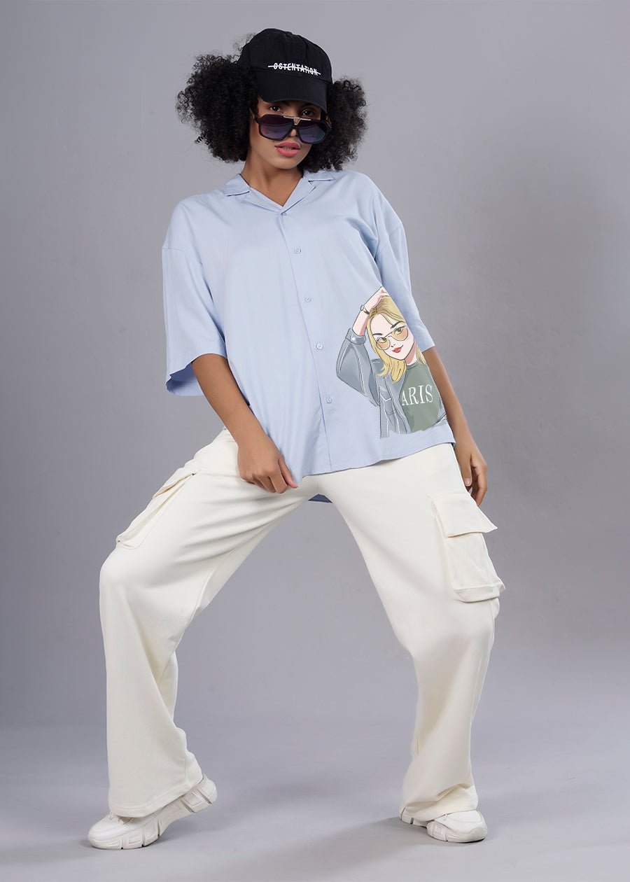 Half Sleeves Curved Bottom Hem Cuban Collar Country of Origin: Proudly Indian Fit: Oversized Fit Fabric: Fluidic Fabric | Sustainable thread used Washing Instructions: Cold machine wash only, flat dry in shade, do not wring Product Description Cool girl sky blue printed fluidic fabric oversized fit shirt for womens by Pronk at lowest prices. Available in XS,S,M,L,XL. Check out vast collection of oversized shirts at our website. Buy now! Color shown in the picture may vary from the actual product due to different lighting