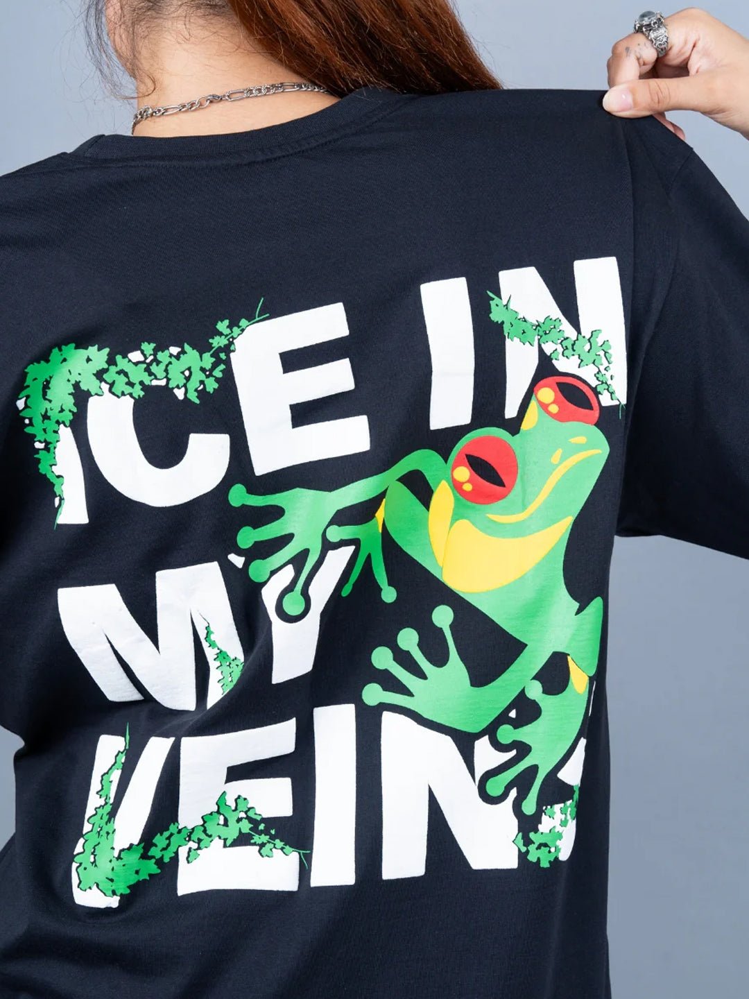 Half Sleeves Crew Neck Puff Printed 220 GSM Fabric Fit: Oversized Fit Fabric: Terry Cotton Size: Model is wearing L size Country of Origin: Proudly Indian Washing Instructions: Machine wash. Do not iron directly or scrub on print. Dry on flat surface as hanging may cause measurement variations Color shown in the picture may vary from the actual product due to different lighting Product Description Shop the Ice In My Veins Puff Printed Black Oversized Terry T-shirt for Women by PRONK. Available in sizes XS, S, M, L, XL & XXL. Style meets comfort!