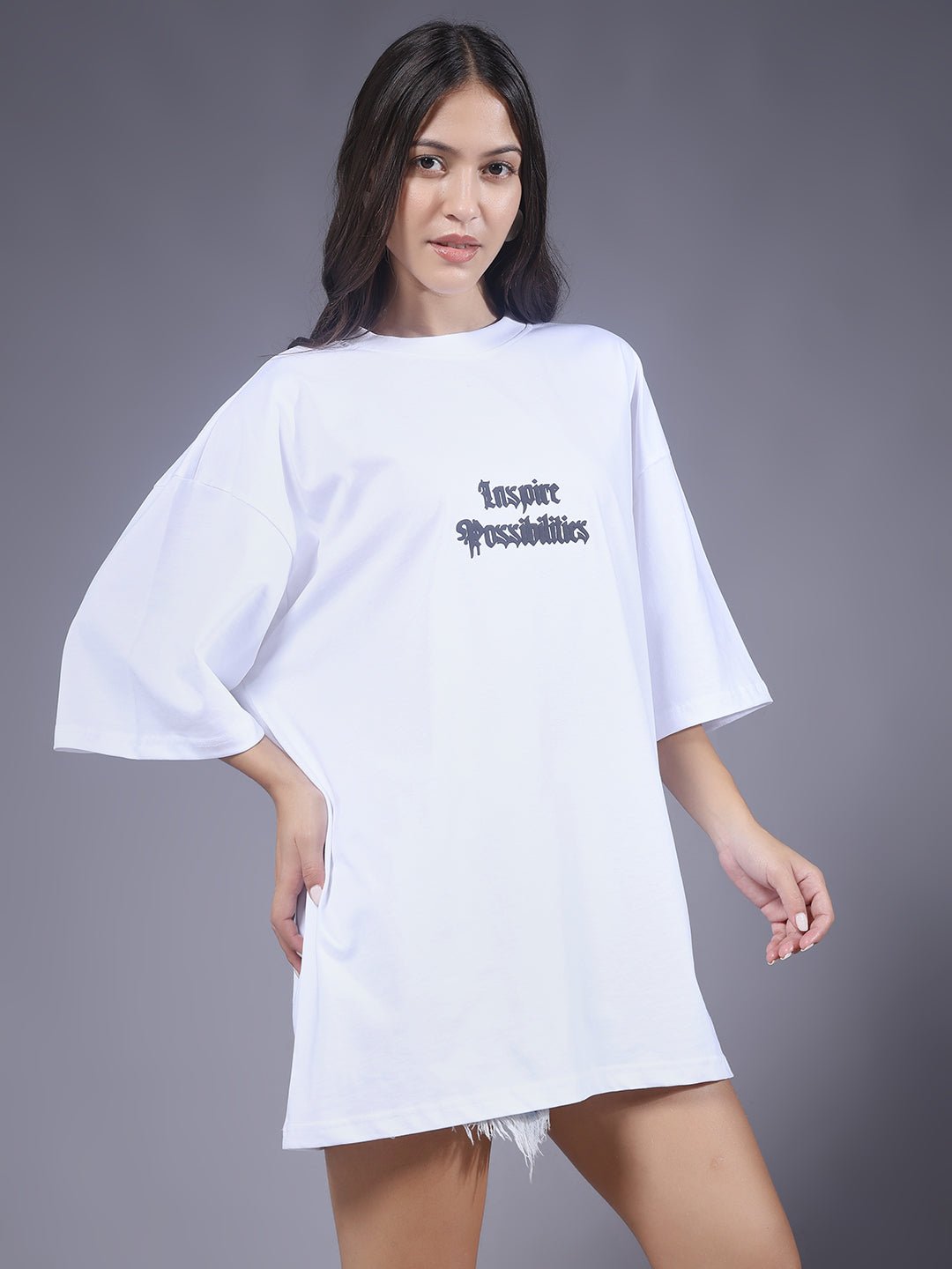 Upgrade your style with our premium Inspire Possibilities Puff Printed Women Oversized T-shirt. Designed for comfort and everyday wear.