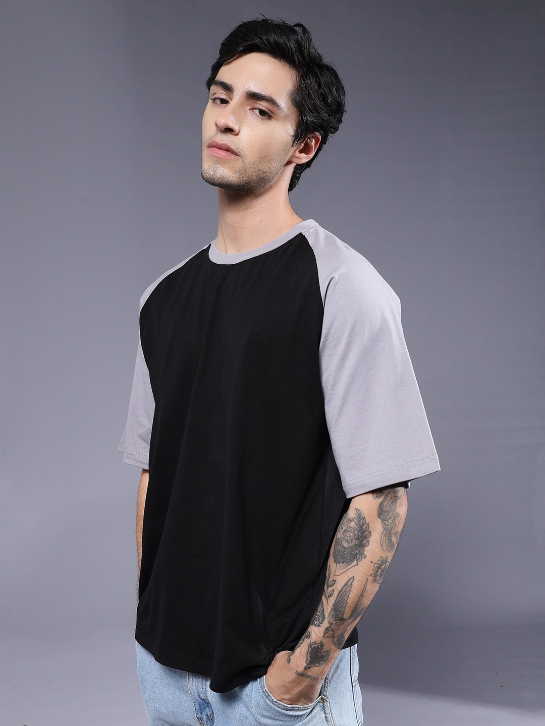 Product Description Men Oversized t-shirt with raglan sleeves and a relaxed fit for a trendy streetwear look. Crafted from soft and breathable fabric to keep you stylish and comfortable all day. Specifications Fit: Oversized Fit Pattern: Colorblock Material: 100% Cotton Neckline: Crew neck Sleeve Type: Half sleevesOccasion: Casual, streetwear Size: Model is wearing L size Country of Origin: Proudly Indian Washing Instructions: Machine wash cold, do not bleach Color shown in the picture may vary from the actual product due to different lighting