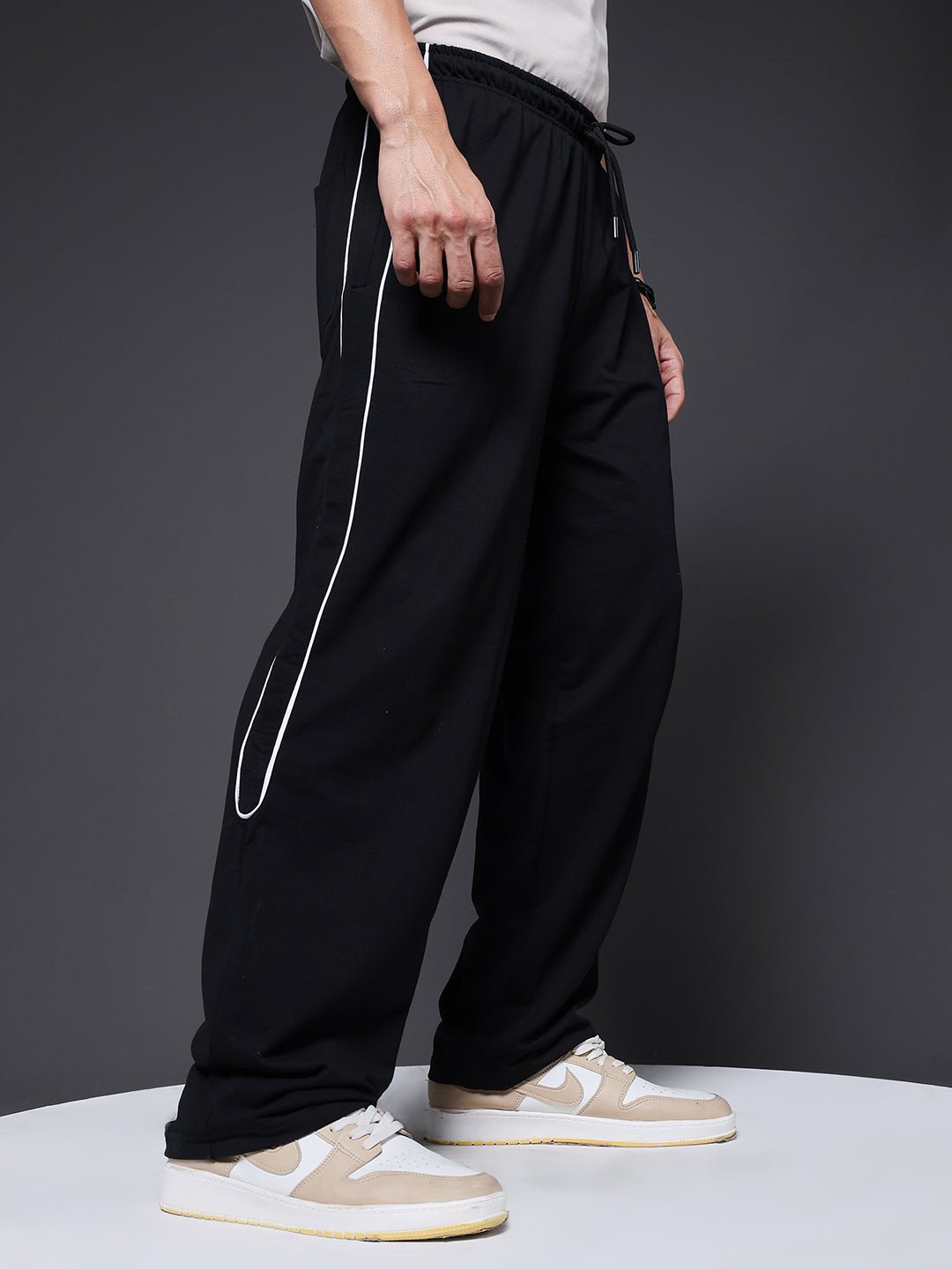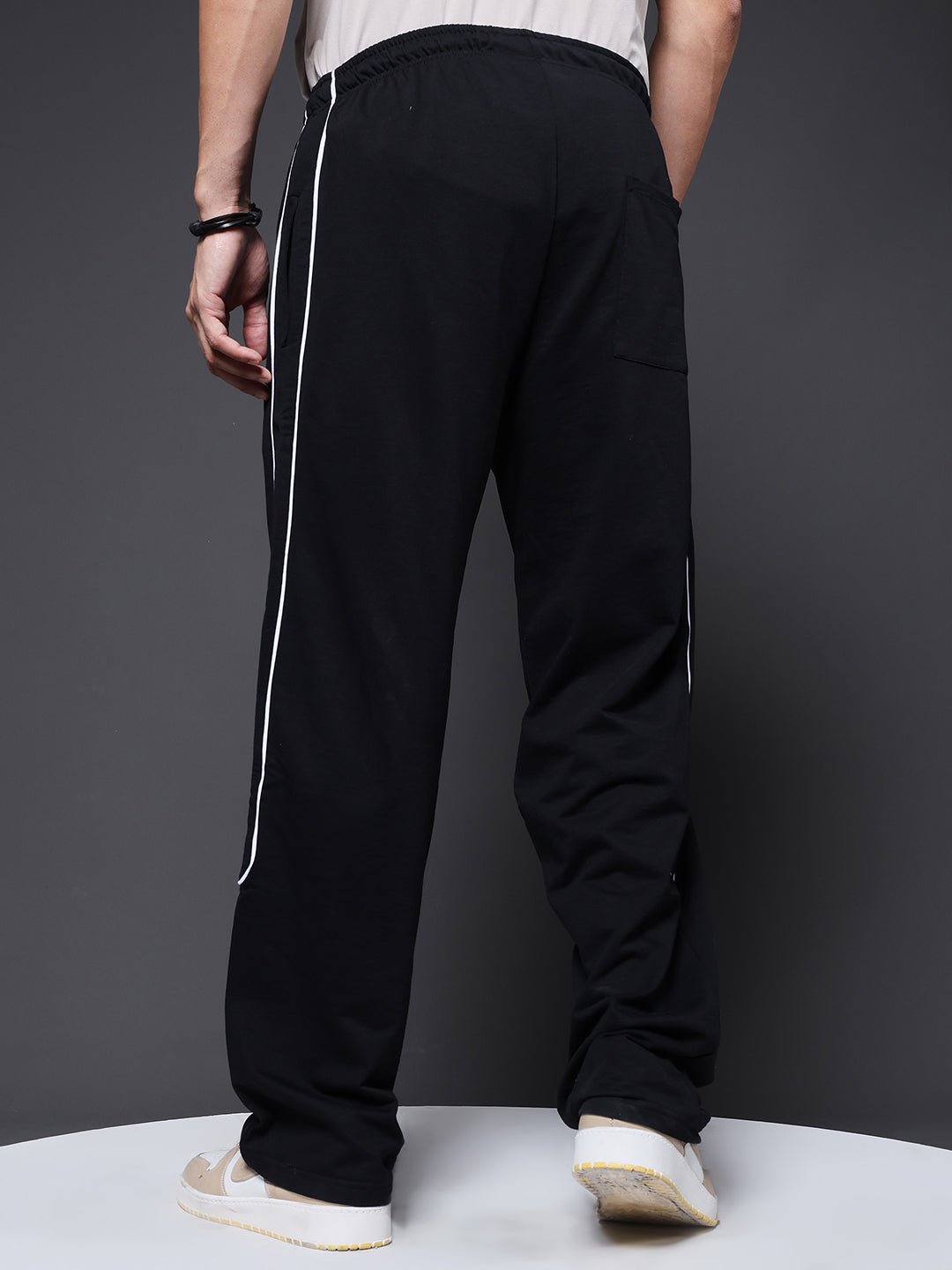 Product Description Men’s relaxed-fit black jogger featuring contrast side stripes and an adjustable drawstring waist for everyday comfort and style. Specifications  Fit: Relaxed Fit Composition: 60% cotton 40% polyester Material: French Terry  Waistband: Elasticated with Drawstring Pockets: 2 side pockets, 1 back pockets  Size: Model is wearing L size Country of Origin: Proudly Indian Washing Instructions: Machine wash.  Color shown in the picture may vary from the actual product due to different lighting