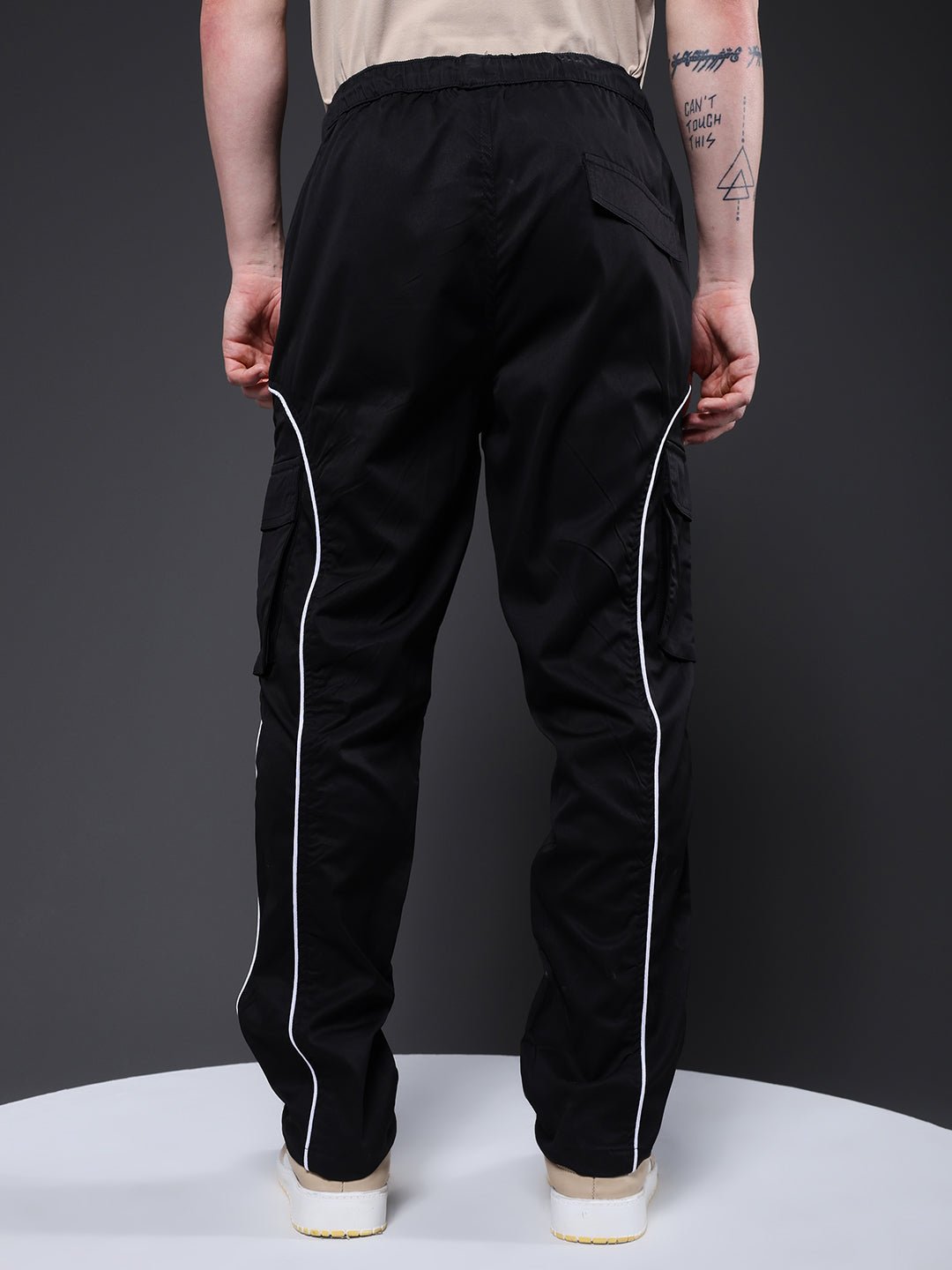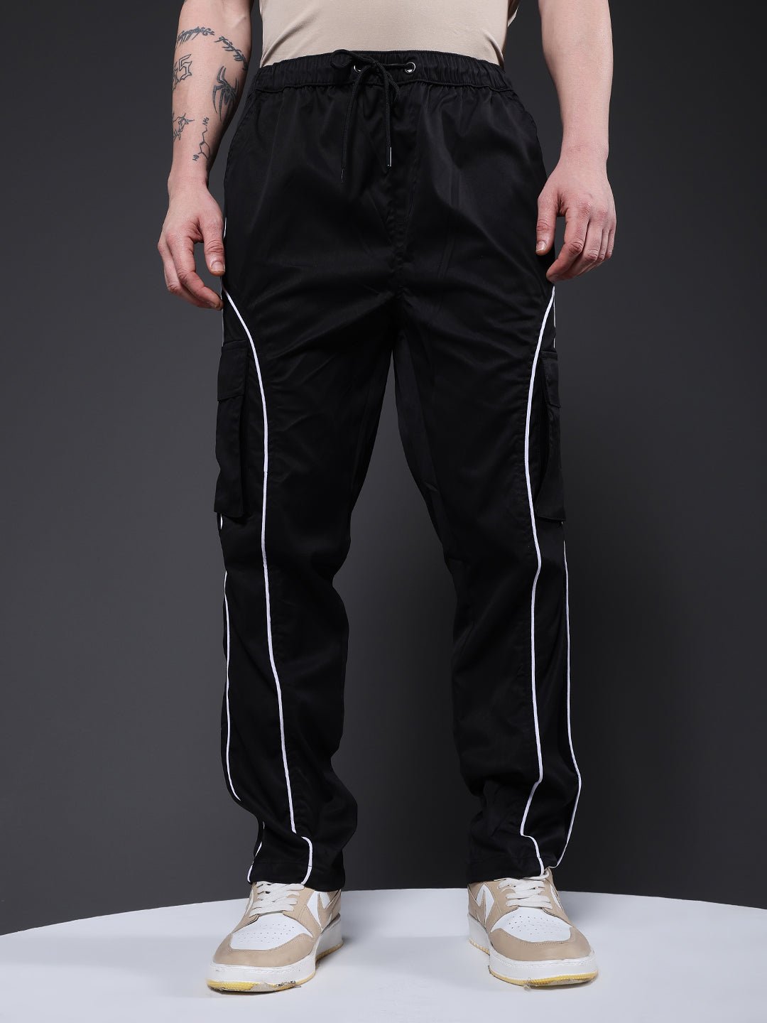 Product Description Men’s relaxed-fit black cargo joggers featuring contrast side stripes, multiple pockets and an adjustable drawstring waist for everyday comfort and style. Specifications Fit: Relaxed Fit Pattern: Solid with Side Stripes Material: Poly Twill Waistband: Elasticated with Drawstring Pockets: 4 front pockets, 1 back flap pocket Size: Model is wearing L size Country of Origin: Proudly Indian Washing Instructions: Machine wash. Color shown in the picture may vary from the actual product due to different lighting
