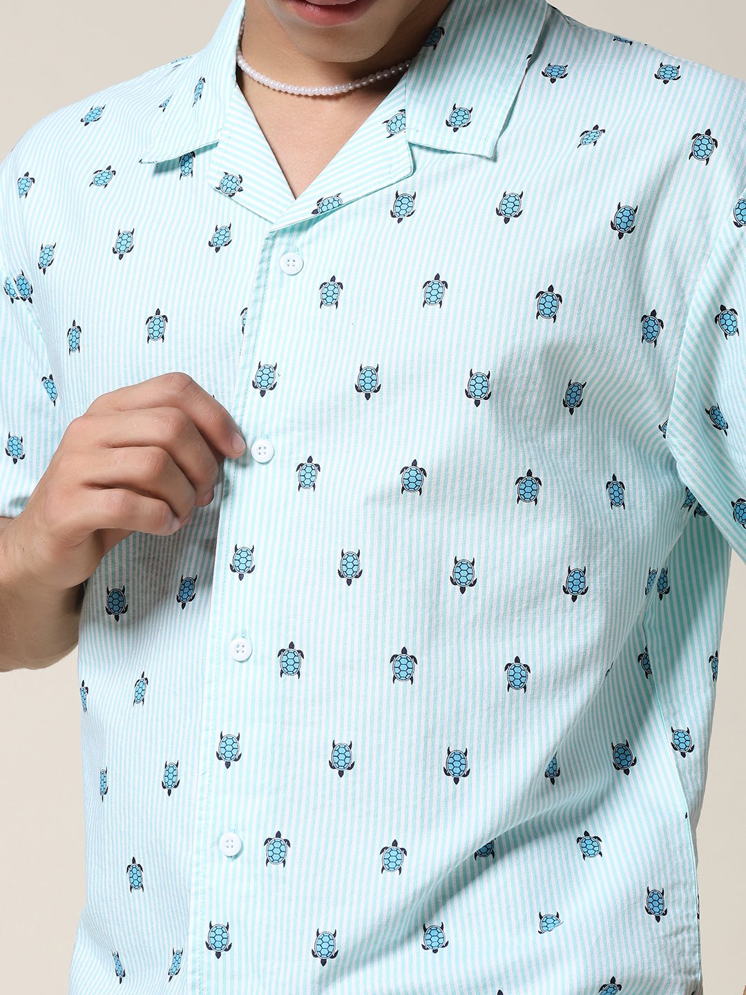 Stay cool and stylish with this Aqua Green half sleeve shirt for men featuring a playful turtle print. Made from soft fabric. it is perfect for casual wear or summer outings. Specifications Sleeve Length: Half Sleeve Fit: Relaxed Fit Collar: Cuban Collar Material: Cotton Fabric Pattern: Turtle Print with Thin Stripes Size: Model is wearing L size Country of Origin: Proudly Indian Washing Instructions: Machine wash. Color shown in the picture may vary from the actual product due to different lighting Product Description Get the best quality mens half sleeve casual shirt in aqua green color online at PRONK. Available in S to XXL size. Explore the trendy collection now!