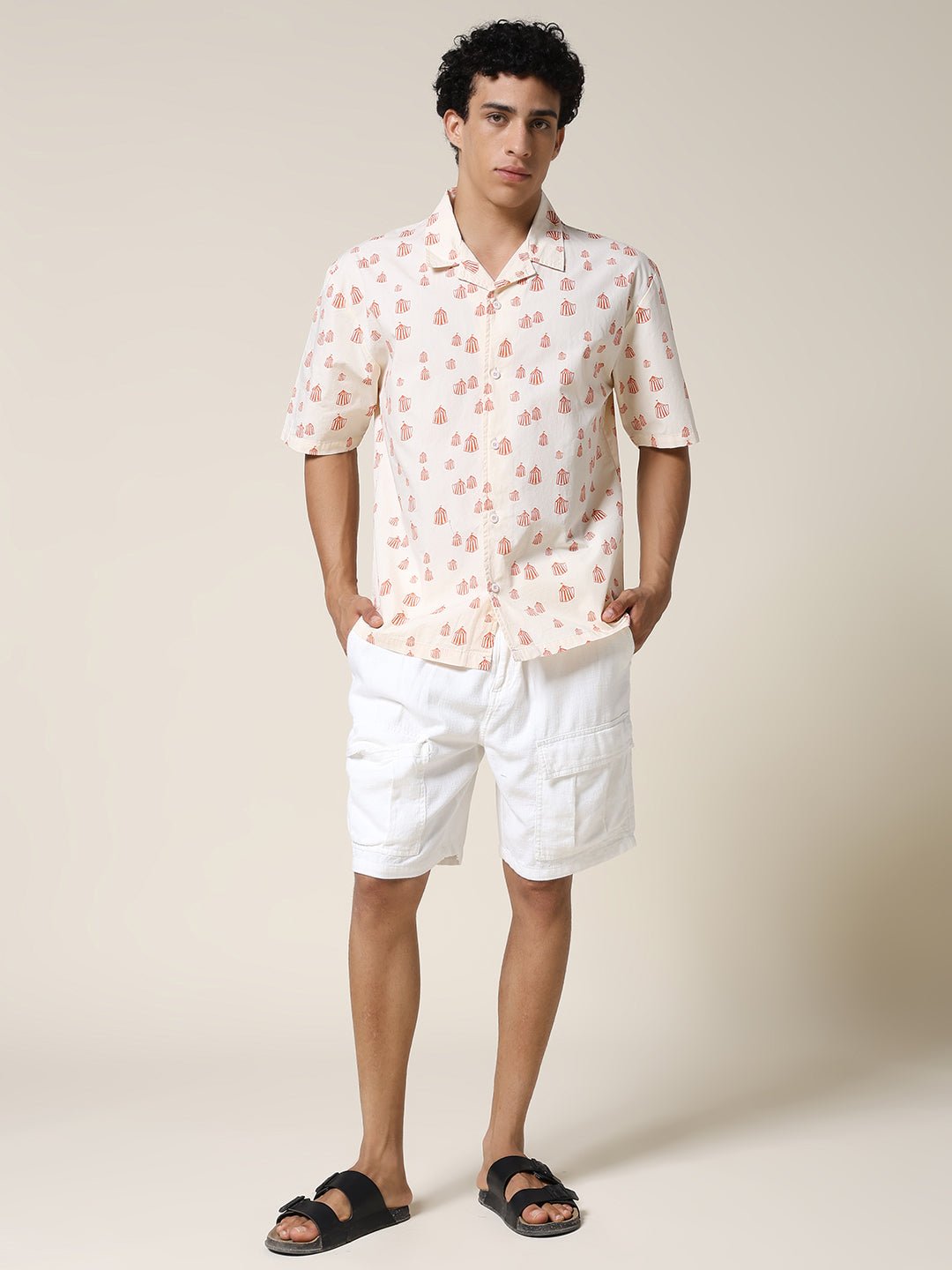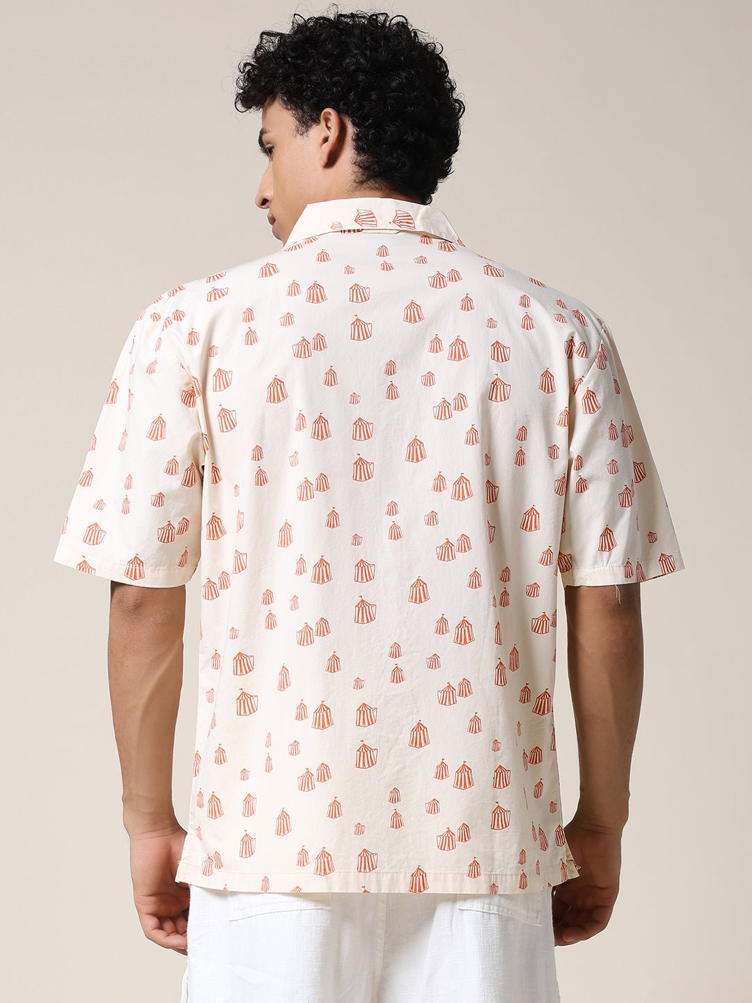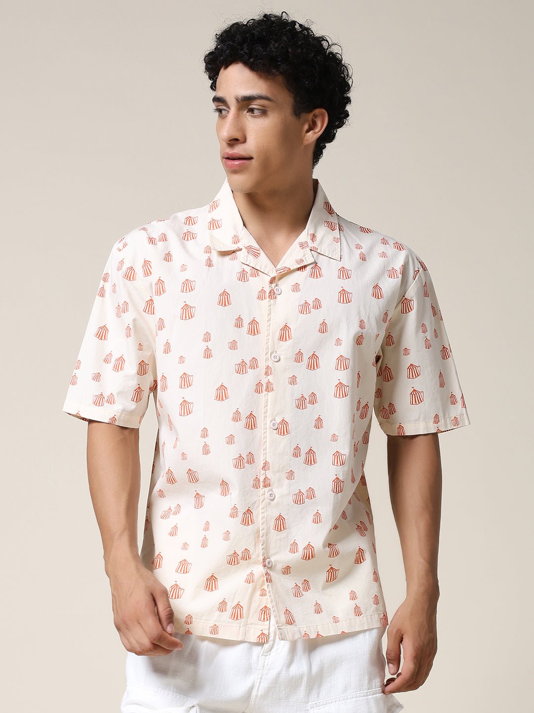 Stay cool and stylish with Beige half sleeve shirt for men featuring Orange Tent Print. Made from soft fabric. it is perfect for casual wear or summer outings. Specifications Sleeve Type: Half Sleeve Fit: Relaxed Fit Pattern: Orange Tent Print Material: Cotton Fabric Neck Style: Cuban Collar Closure: Front Button-Down Size: Model is wearing L size Country of Origin: Proudly Indian Washing Instructions: Machine wash. Color shown in the picture may vary from the actual product due to different lighting Product Description Elevate your look with beige color mens half sleeve casual shirt. Buy online from PRONK at the best price available in S to XXL size. Shop online now!