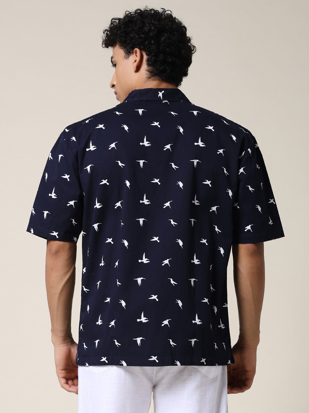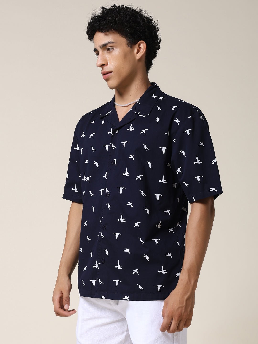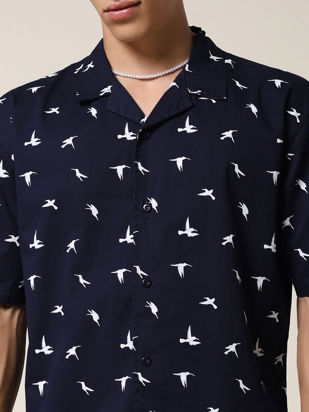 Stay cool and stylish with Navy half sleeve shirt for men featuring White Bird print. Made from soft fabric. it is perfect for casual wear or summer outings. Specifications Sleeve Type: Half Sleeve Fit: Relaxed Fit Pattern: White Bird Print Material: Cotton Fabric Neck Style: Cuban Collar Closure: Front Button-Down Size: Model is wearing L size Country of Origin: Proudly Indian Washing Instructions: Machine wash. Color shown in the picture may vary from the actual product due to different lighting Product Description Buy premium quality navy color mens half sleeve casual shirts online from PRONK at best price. Available in S to XXL size. Explore the latest collection now!