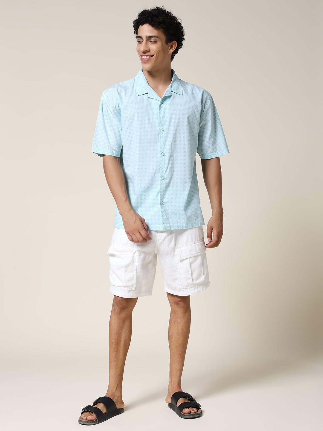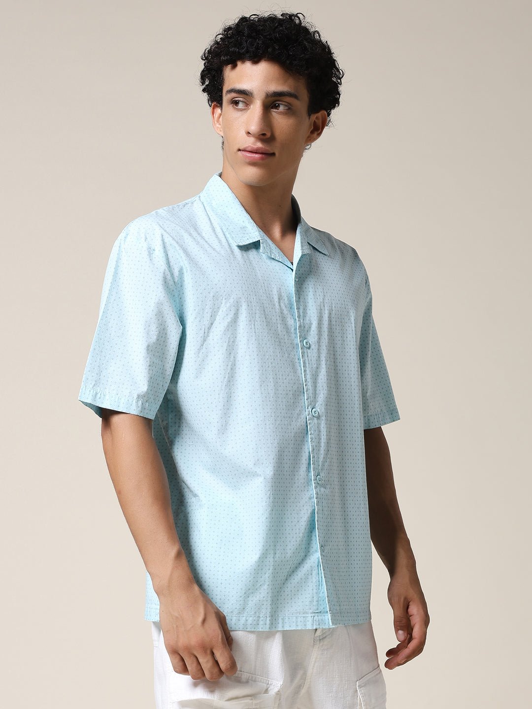 Stay cool and stylish with Sky half sleeve shirt for men featuring Small Dot Print. Made from soft fabric. it is perfect for casual wear or summer outings. Specifications Sleeve Type: Half Sleeve Fit: Relaxed Fit Pattern: Small Dot Print Material: Cotton Fabric Neck Style: Cuban Collar Closure: Front Button-Down Size: Model is wearing L size Country of Origin: Proudly Indian Washing Instructions: Machine wash. Color shown in the picture may vary from the actual product due to different lighting Product Description Buy sky color mens half sleeve casual shirt online from PRONK. Available in S to XXL size. Choose from the wide collection of mens half sleeve casual shirts.
