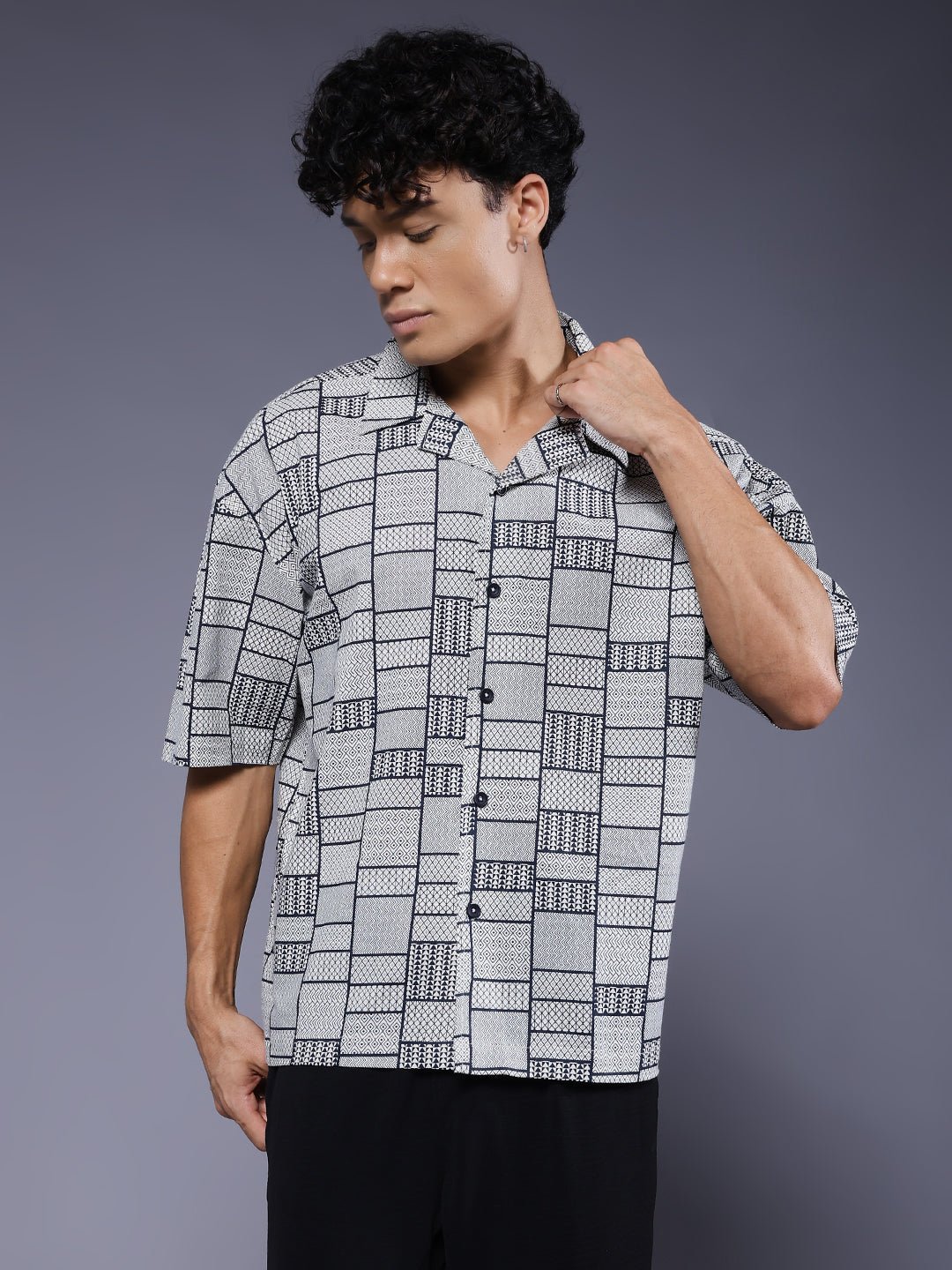 Stay cool and stylish with White half sleeve shirt for men featuring relaxed fit and bold abstract design. Made from soft rayon fabric. it is perfect for casual wear or summer outings. Specifications Sleeve Type: Half Sleeve Fit: Relaxed Fit Pattern: Breeze Material: 100% Cotton Fabric Neck Style: Cuban Collar Closure: Front Button-Down Size: Model is wearing L size Country of Origin: Proudly Indian Washing Instructions: Machine wash. Color shown in the picture may vary from the actual product due to different lighting Product Description Buy men’s half sleeve casual shirt online from PRONK. Available in XS to XL size. Choose from the wide collection of men’s half sleeve casual shirts.