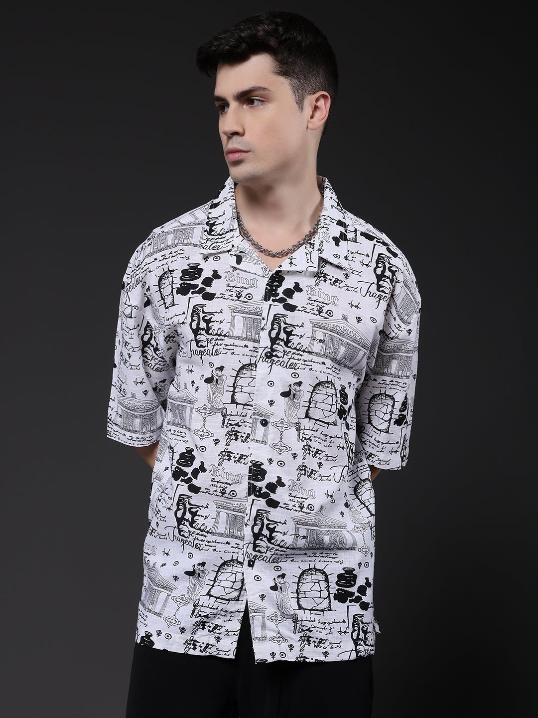 Stay cool and stylish with white half sleeve shirt for men featuring relaxed fit and bold abstract design. Made from soft rayon fabric. it is perfect for casual wear or summer outings. Specifications Sleeve Type: Half Sleeve Fit: Relaxed Fit Pattern: Breeze Material: Cotton Slub Fabric Neck Style: Cuban Collar Closure: Front Button-Down Size: Model is wearing L size Country of Origin: Proudly Indian Washing Instructions: Machine wash. Color shown in the picture may vary from the actual product due to different lighting Product Description Buy men’s half sleeve casual shirt online from PRONK. Available in XS to XL size. Choose from the wide collection of men’s half sleeve casual shirts.