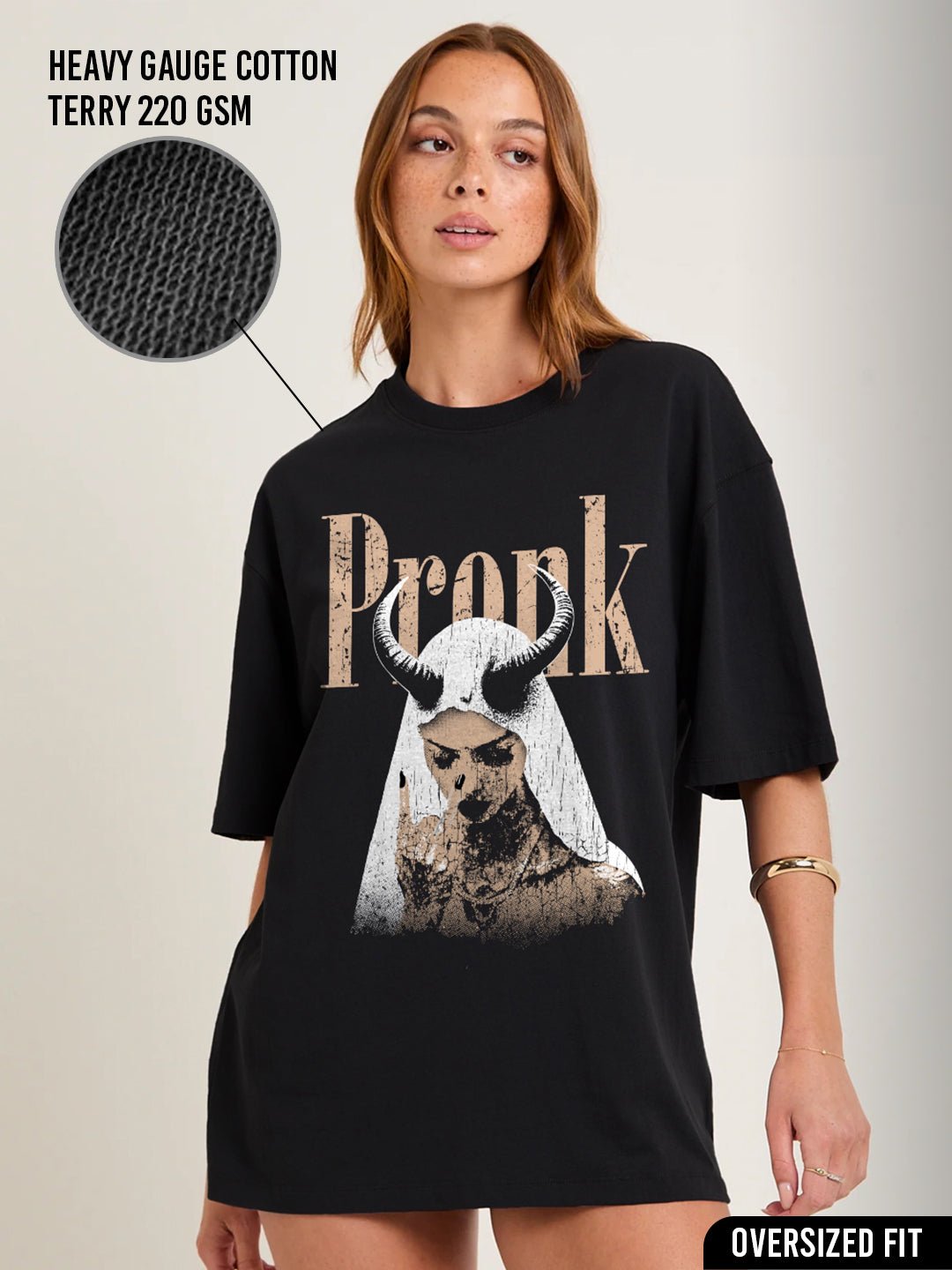 Product Detail : Oversized Fit Printed / Graphic print 100% Terry Cotton Crew neck Half sleeves Fit: Oversized Fit Fabric: 100% Premium Terry Cotton | Sustainable 2X stronger cotton thread used Size: Model is wearing L size Country of Origin: Proudly Indian Washing Instructions: Machine wash. Do not iron directly or scrub on print. Dry on flat surface as hanging may cause measurement variations Color shown in the picture may vary from the actual product due to different lighting Product Description Buy premium Solid Women oversized t-shirt in black color at Pronk. Available in XS, S, M, L, XL, XXL size. Choose from the latest trendy designs of men’s oversized t shirts. Shop online now!