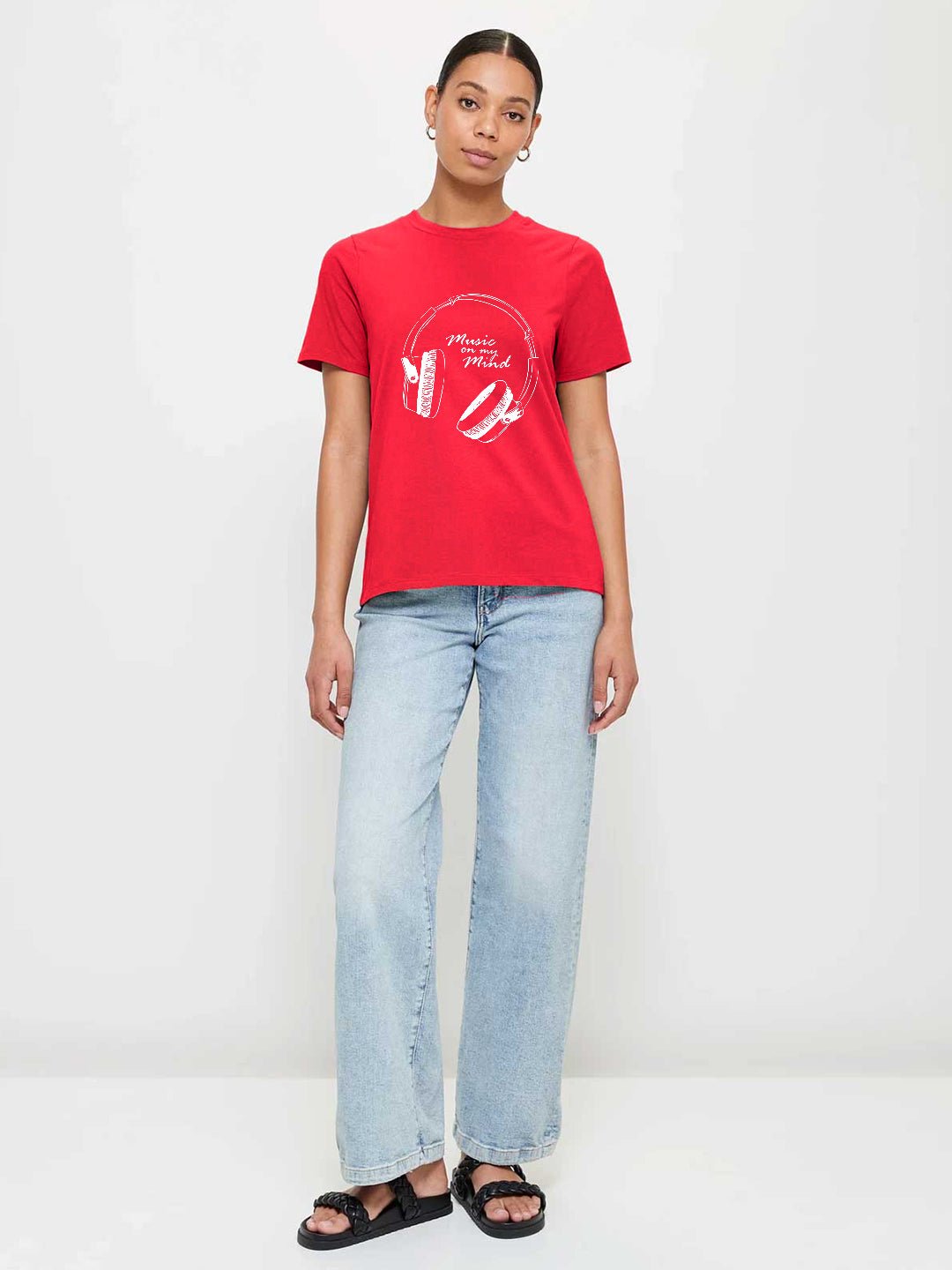 Upgrade your everyday style with this premium graphic T-shirt designed for comfort and a modern look. Made from cotton fabric. it’s perfect for casual wear all day long. Crew Neck Half Sleeves Regular Fit 180 GSM  Fabric: 100% Premium Cotton  Size: Model is wearing L size Country of Origin: Proudly Indian Washing Instructions: Machine wash. Do not iron directly or scrub on print. Dry on flat surface as hanging may cause measurement variations Color shown in the picture may vary from the actual product due to different lighting Product Description Elevate your look with candy red color music on my mind women half sleeve t-shirt. Buy online now from PRONK, available in XS,S,M,L,XL,XXL size.