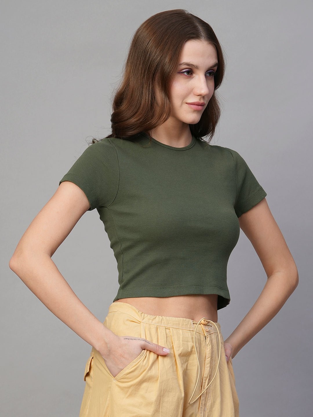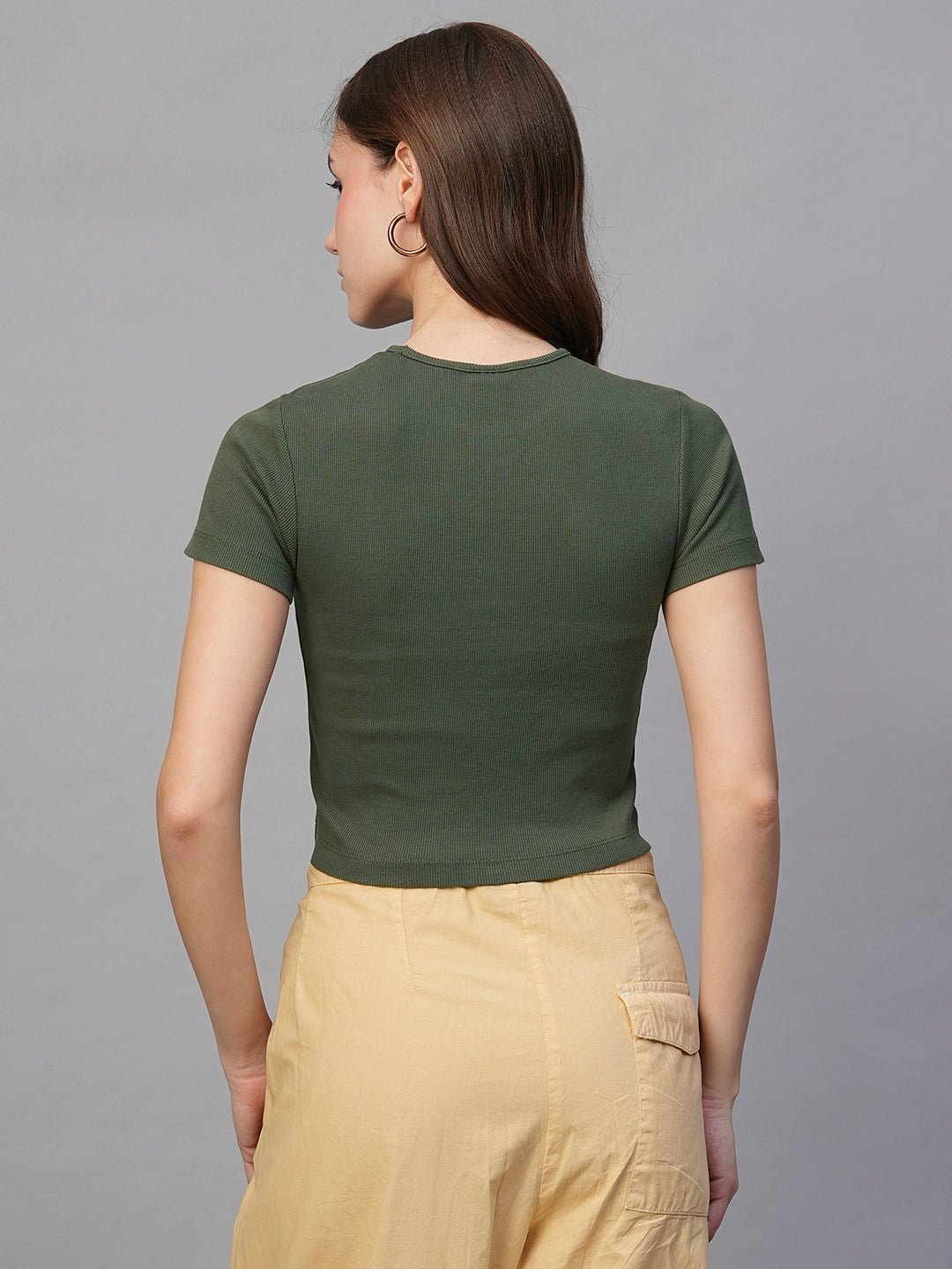 Upgrade your style with our premium Celestialarcane Ribbed Half Sleeve Crop Top – Olive Green. Designed for comfort and everyday wear.