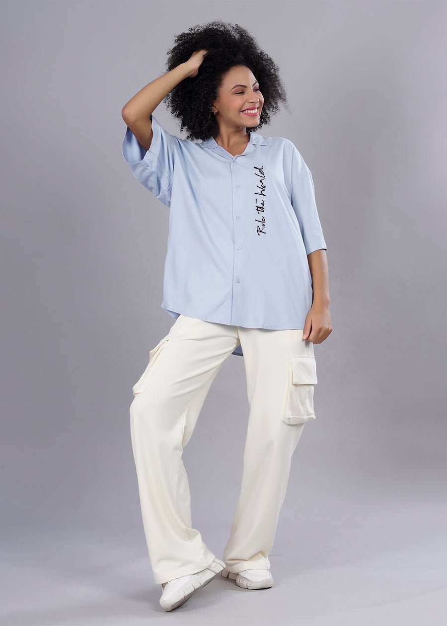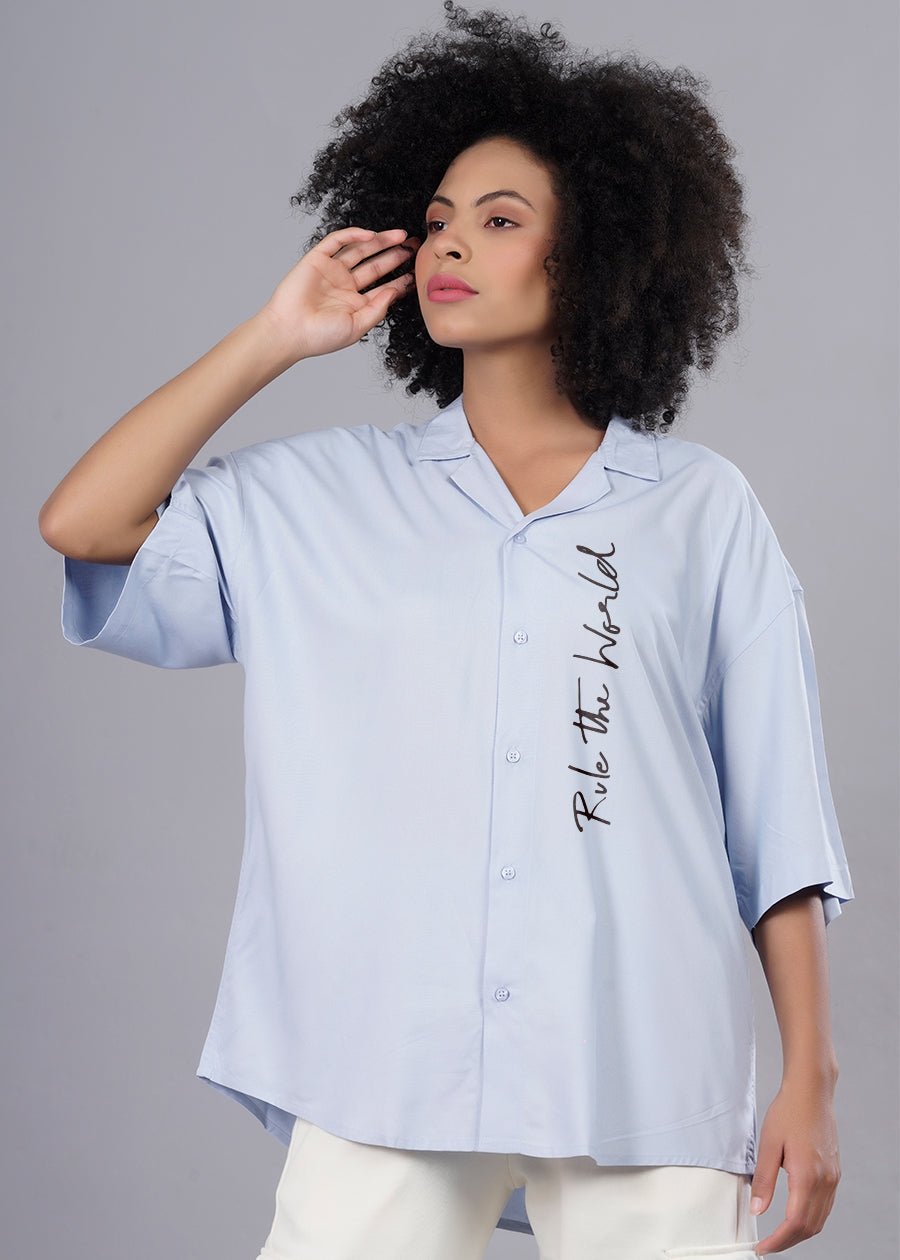 Half Sleeves Curved Bottom Hem Cuban Collar Country of Origin: Proudly Indian Fit: Oversized Fit Fabric: Fluidic Fabric | Sustainable thread used Washing Instructions: Cold machine wash only, flat dry in shade, do not wring Product Description Sky blue rule the world oversized shirt for womens by Pronk online in India. Available in XS,S,M,L,XL. View more oversized women shirts at our website. Shop now with free worldwide shipping. Color shown in the picture may vary from the actual product due to different lighting