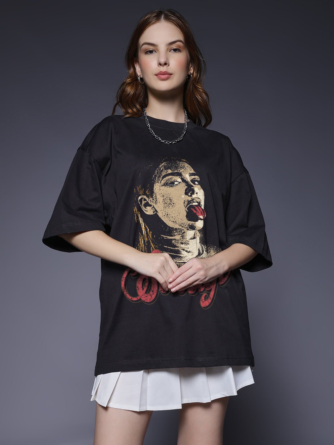 Product Detail : Oversized Fit Printed / Graphic print Crew neck Half sleeves Fit: Oversized Fit Fabric: 100% Premium Cotton | Sustainable 2X stronger cotton thread used Size: Model is wearing L size Country of Origin: Proudly Indian Washing Instructions: Machine wash. Do not iron directly or scrub on print. Dry on flat surface as hanging may cause measurement variations Color shown in the picture may vary from the actual product due to different lighting Product Description Buy premium Women printed oversized t-shirt in black color at Pronk. Available in XS, S, M, L, XL, XXL size. Choose from the latest trendy designs of women’s oversized t shirts. Shop online now!