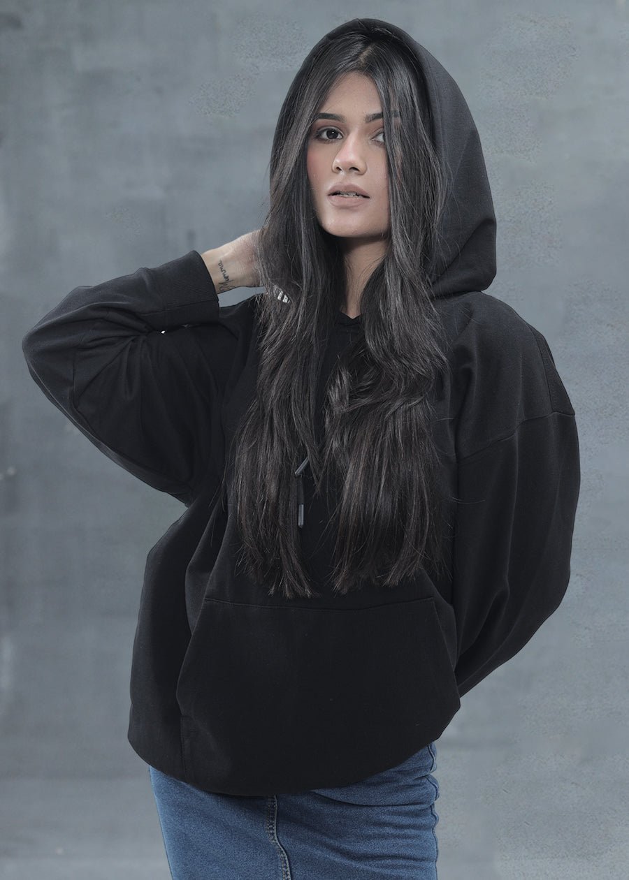 Upgrade your style with our premium Solid Black Women Drop Shoulder Premium Terry Hoodie | Celestialarcane. Designed for comfort and everyday wear.