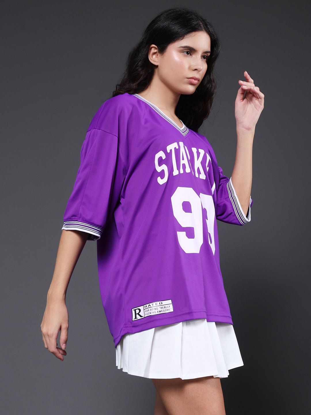 Elevate your casual style with this bold purple varsity T-shirt featuring a bold print. Crafted for comfort with a relaxed fit 200 GSM Oversized Fit Printed / Graphic print V-neck with striped detailing Half sleeves with striped cuffs Fabric: 100% Polyester | Sustainable 2X stronger cotton thread used Size: Model is wearing L size Country of Origin: Proudly Indian Washing Instructions: Machine wash. Do not iron directly or scrub on print. Dry on flat surface as hanging may cause measurement variations Color shown in the picture may vary from the actual product due to different lighting Product Description Buy premium Women printed oversized varsity t-shirt in purple color at Pronk. Available in S, M, L, XL size. Choose from the latest trendy designs of women’s oversized t shirts. Shop online now!