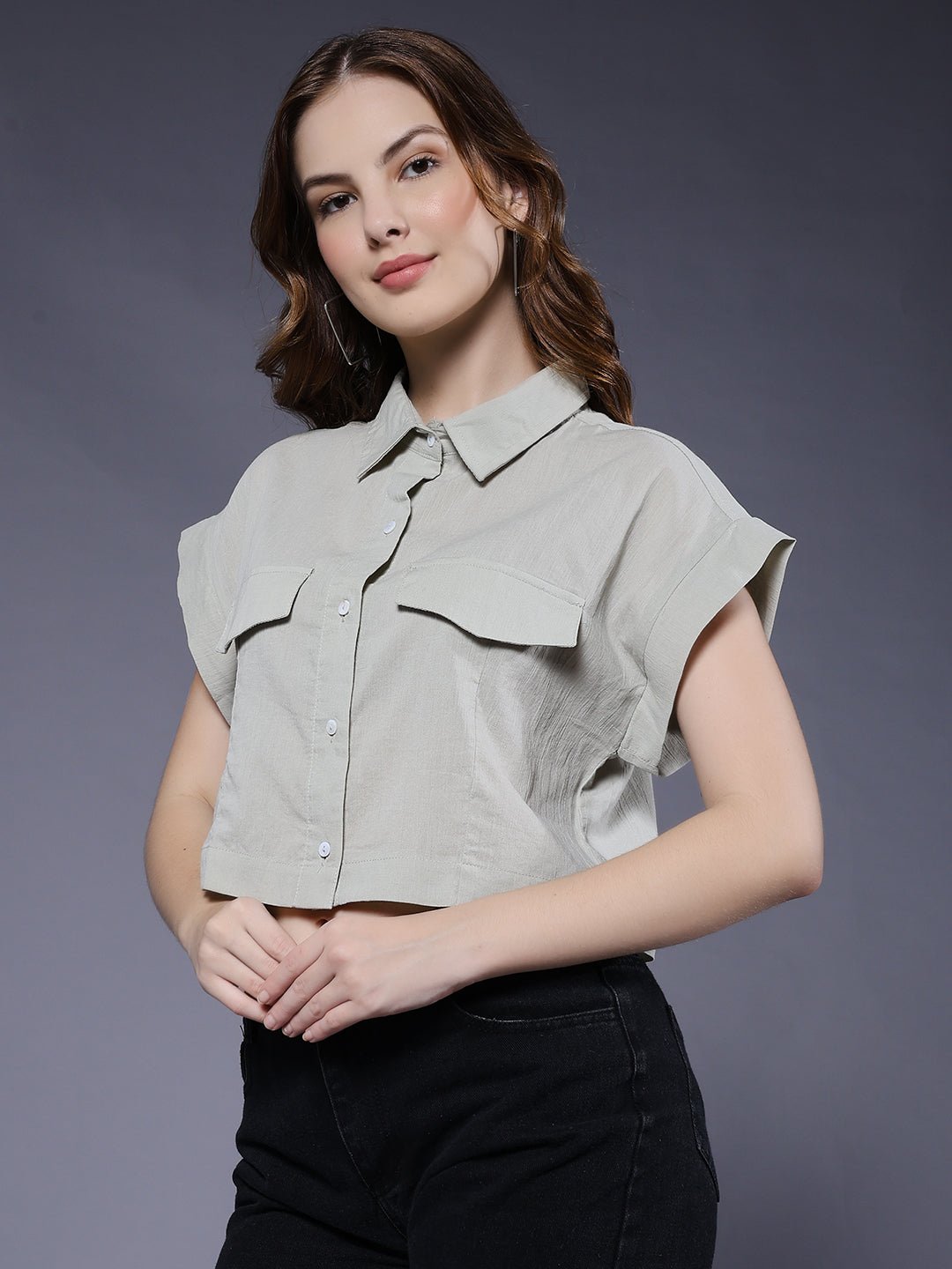 Stylish mint green crop shirt featuring a clean button-down design and dual front pockets. Its relaxed fit and soft fabric make it perfect for casual outings or everyday wear. Specifications Sleeve Type: Half Sleeve Fit: Relaxed Fit Pattern: Solid Material: 100% Crinkle Cotton Neck Style: Spread Collar Closure: Front Button-Down Size: Model is wearing L size Country of Origin: Proudly Indian Washing Instructions: Machine wash. Color shown in the picture may vary from the actual product due to different lighting Product Description Buy Women Solid Crop Shirt with Flap Front Pockets online in India by Pronk at the lowest price . Available in xs, s, m, l, xl size. Explore a vast collection of women’s topwear at our website.