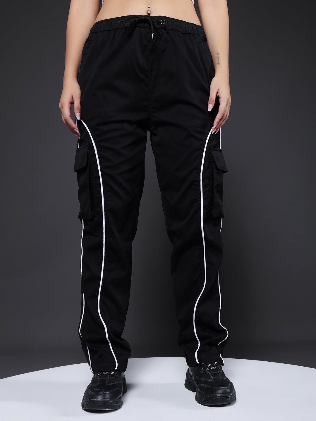 Product Description Women’s relaxed-fit black cargo joggers featuring contrast side stripes, multiple pockets and an adjustable drawstring waist for everyday comfort and style. Specifications Fit: Relaxed Fit Pattern: Solid with Side Stripes Material: Poly Twill Waistband: Elasticated with Drawstring Pockets: 4 front pockets, 2 back pockets Size: Model is wearing L size Country of Origin: Proudly Indian Washing Instructions: Machine wash. Color shown in the picture may vary from the actual product due to different lighting